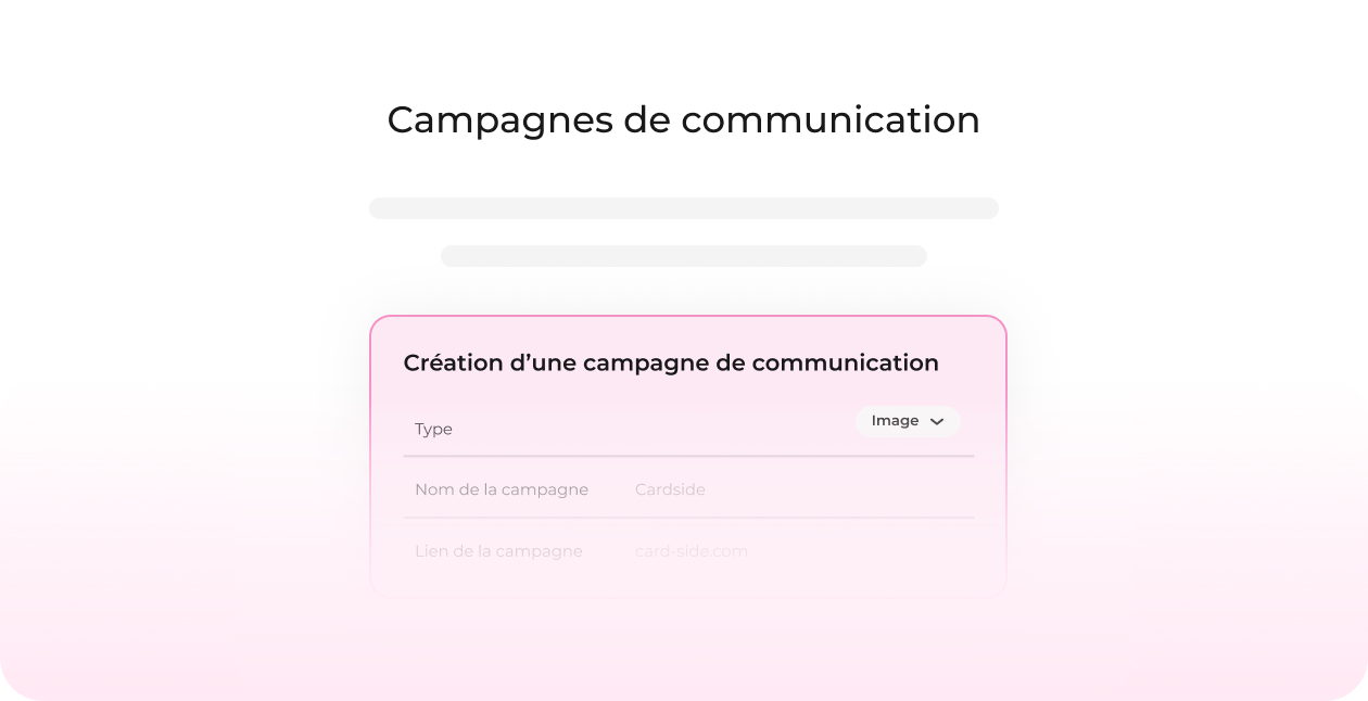 Ajoutez votre campagne dans l'onglet dédié sur la plateforme Cardside. Vous pouvez y ajouter de nouvelles campagnes en quelques clics, en choisissant le contenu à promouvoir, qu'il s'agisse d'une image ou d'un gif animé.