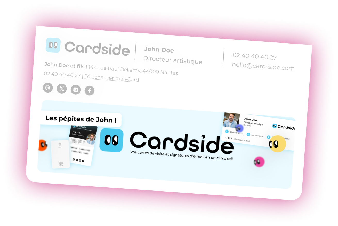 Avec Cardside, votre carte de visite devient une signature d’e-mail captivante et interactive, renforçant ainsi votre image de marque et incitant les destinataires à devenir des clients.